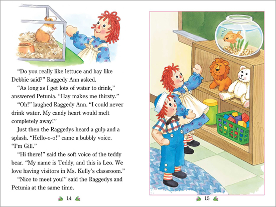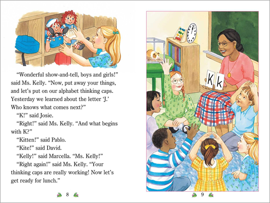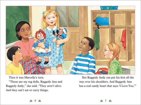 It is showandtell day at Marcella's school. Classmates eagerly present their special objects, including a guinea pig and a toy truck. Marcella has brought two of her favorite friends, Raggedy Ann and Raggedy Andy. She points out Andy's flexibility and Ann's candy heart that says "I Love You." Next, Ms. Kelly has the children put on their "thinking caps" to brainstorm words which start with the letter K. Students are excited about their introduction to the new world of learning. When they take a lunch break, we get to see yet another new world&-the world that comes to life when no human is looking! A rustle from Marcella's cubby reveals two friendly-and very much alive-rag dolls. The guinea pig, goldfish and stuffed animals get better acquainted, until the truck offers to take Ann and Andy for a ride. Their adventure through the long school hallways almost ends in disaster when the explorers lose their way. Luckily, Andy remembers his thinking cap and words that start with K, like Ms. Kelly. By studying the classroom doors, the dolls find their way back to the cozy cubby just in time for the children to return. This is a great book for representing the great big world of school as more inviting to kindergartners. A ready to read book, it may even give older siblings a chance to comfort the first timers. |