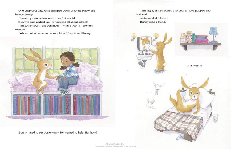 Bunny and his forest friends meet at the town library every Saturday morning for book club. But one summer day, their library buddy Josie confesses to Bunny that she's nervous about starting school. Bunny has an idea: He'll go with her! Soon, Bunny's friends Bear, Raccoon, Bird, Porcupine, Squirrel, Mole, Mouse, and Frog decide to join him-and Josie's first day of school turns into a critter-filled adventure!