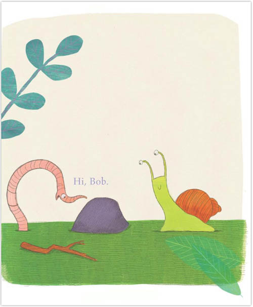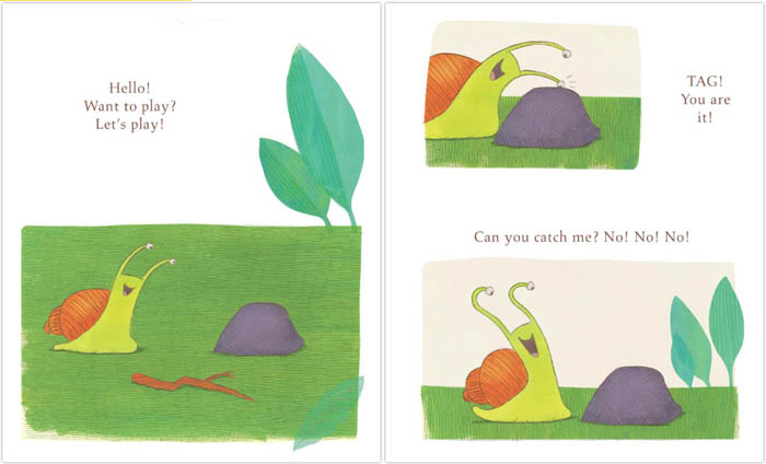 ¡°Hello! Want to play?¡¦Can you catch me? No! No! No!¡± It¡¯s no surprise the gastropod has the upper hand: Snail is talking to a rock (and not even a sentient one at that). When Worm approaches, curious about the game, a new friendship is formed. They bond over small victories (Snail climbs a flower while Worm acts as cheerleader in ¡°Snail¡¯s Adventure¡±) and common interests (¡°Meet My Pet¡± reveals that they both have unusual pets). Like lots of easy-reader duos--Frog and Toad, Elephant and Piggie, Bink and Gollie, to name a few--there¡¯s an odd-couple dynamic at work: Worm is down-to-earth (which seems fitting), while Snail is more of a dreamer. Unlike the similarly levelheaded Toad, Gerald, and Gollie, however, Worm doesn¡¯t suffer from know-it-all-itis. The invertebrate remains sincere, loyal, and guileless throughout, even when Snail is being very silly. Kügler¡¯s simple text, all in color-coded dialogue, includes some good jokes that rely gleefully on the mixed-media illustrations to hit their punch lines: Snail, from atop the flower, eyes on shell, says, ¡°Wow! I can see my house!¡± Though the pictures almost all take place on the same patch of ground, their variety of format--panels, spots, full pages, spreads, thought bubbles—keeps things lively while helping direct the eyes of readers looking for a laugh. |