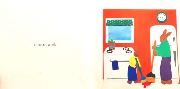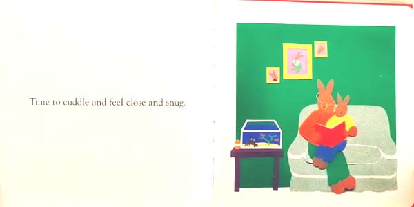 Shades of Goodnight Moon. Instead of bidding adieu to objects in Baby Rabbit's room and world, this youngster and a parent approach bedtime by recounting the activities of the day in simple rhyme. The text and collages depict a day full of work, play, quiet time, reading, cuddling, and hugging. If the effort as a whole borders on the cloying, the clean design and the book's small, square format make it a likely success. The artwork is so simple and colorful that the book will work both for bedtime reading at home and small storytimes.