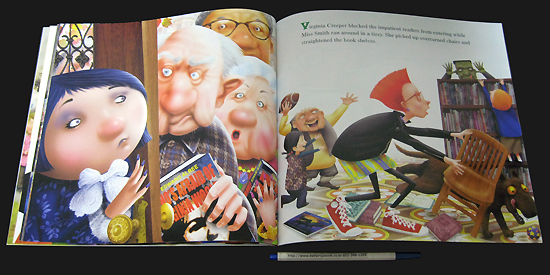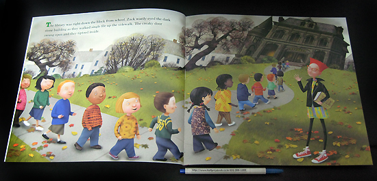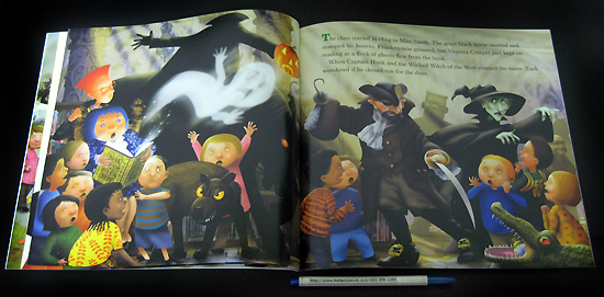 One fall day, Miss Smith takes her class to the public library to meet the librarian, Virginia Creeper. The scene is set as they enter the building, which looks a bit like a haunted house. The librarian reads spooky stories from Miss Smith's Incredible Storybook, which brings the characters to life. Soon the children are surrounded by frightening figures such as Frankenstein, Count Dracula, Captain Hook, and the Jabberwocky. They enjoy themselves so much that the youngsters forget what time it is and then must rush to finish each story so the characters can go back into the book. In all the chaos, it seems one story was overlooked. So far, Zack is the only student to notice a creature lurking nearby. Falling leaves and pictures of ghosts, pumpkins, and witches complete the autumnal scene. Halloween can be inferred, but it is not mentioned by name. Each page is full of clever details, and the characters have unique characteristics, from the librarian's bright purple hair and dress, to Miss Smith's stand-up red hair, to the book characters playing out their roles. The students in particular are expressive. One page shows them with their mouths open while the Headless Horseman looms above. The story captures the joy of reading and is sure to be a hit. |