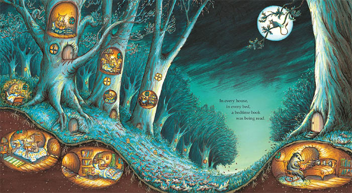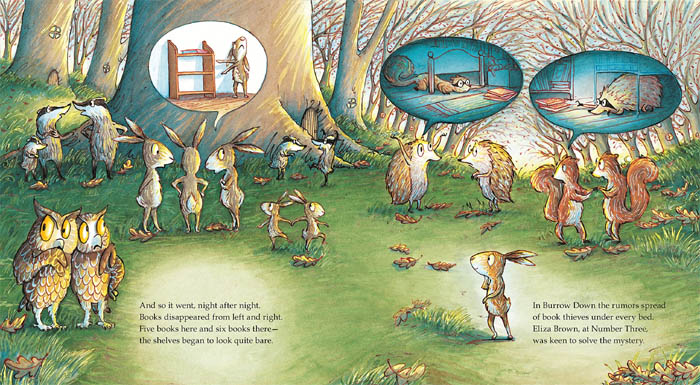 It's bedtime in the woods of Burrow Down, and all the animals are ready for their bedtime story. But books are mysteriously disappearing. Eliza Brown decides to stay awake and catch the book thief. It turns out to be a little creature called the Snatchabook who has no one to read him a bedtime story. All turns out well when the books are returned and the animals take turns reading bedtime stories to the Snatchabook.