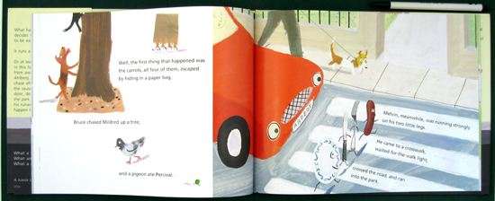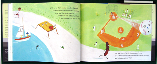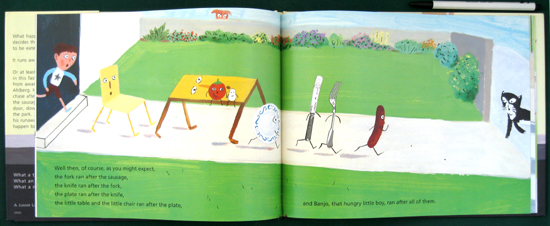 Banjo Cannon is an ordinary sort of boy who happens to have a sausage for his dinner every day, all year long, until.... One day a particular sausage named Melvin jumps off the plate and runs away, followed by Banjo's fork, knife, plate, table, chair, and finally a hungry Banjo. And from the plate, running along, follow peas, carrots, and fries. In Ahlberg's absurd, chummily colloquial fantasy text, even the vegetables have names, with the fries being French, "of course." As they all run through town, followed also by Mr. And Mrs. Cannon, Mildred the cat, and Bruce the neighbor's dog, they have a series of happy and disastrous adventures. Only Melvin is left, slowing down, caught and almost eaten by Banjo. But of course his mother will not let him eat anything that has been on the ground. So there is a stroll back home, collecting characters along the way, until Banjo can finally get to eat his usual plum pie dessert named Joyce...or can he? The nonsense of the text is appropriately accompanied by rather childlike acrylic illustrations. Ingman mixes vignettes with large, more fully developed scenes, frequently leaving drawings unpainted for a surreal touch. The hurrying characters, from Banjo on down to the line of fries and peas, all have personalities to add to the zany fun.