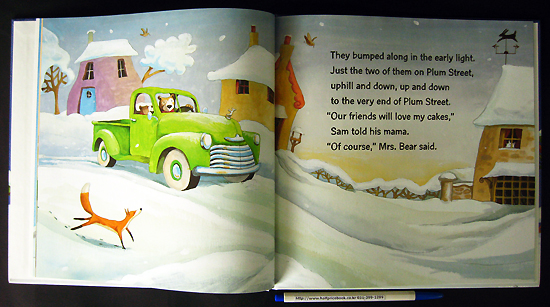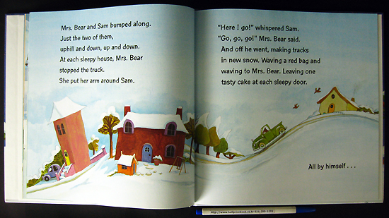 Sam and his mother are baking cakes?golden-brown cakes for their friends on Plum Street." Impatient Sam can't wait until the cakes are ready, then to be left as tasty surprises on the doorsteps of his friends. But when Mrs. Bear stops the green truck at the first house and says, "Here we are, Sam. I'll wait here and YOU take the cake," he doubtfully whispers "All by myself?" Mrs. Bear puts her arm around the anxious Sam and assures him that he can do it. So off Sam goes all alone to deliver the cake. Leaving the cake, he runs back to the truck, proudly telling his Mama "I did it!" So they go from one sleepy house to the next and Sam leaves a tasty cake at each door all by himself. When the job is done, Mrs. Bear and Sam return home to enjoy cakes and cocoa and tell each other stories "about a bear called Sam who takes cake (all by himself!) to his friends." The story and illustrations lovingly depict the warm and companionable relationship between a young bear and his mother as she helps him take those important and scary all-by-myself steps to independence.