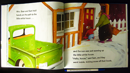 In this third visit to the cozy home of a little bear and his loving mama, Sam has grown just a bit bigger, but not much bolder. When the two of them set out to make early-morning deliveries of the tasty cakes they have baked for their friends, Mrs. Bear encourages him to go to their doors. "All by myself?" he whispers. A heartening hug helps him to muster up his courage and make his way through the new snow to leave a red-bagged surprise on the doorsteps of several houses. And when they return home from making these neighborly gestures, there are two bags left over, just right for a brave little cub and his caring mother. Mrs. Bear in her big green sweater, the homey quilt-square curtains in the snug and humble kitchen, and the white mice with whom the bears share their home are warm and familiar. Jeram's bright, acrylic palette is gold-kissed and glowing. And while this story is not as fluid or as rhythmic as its companions, Sam's fans will find little fault with it.