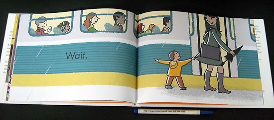 As a boy and his mother move quickly through the city, they're drawn to different things. The boy sees a dog, a butterfly, and a hungry duck while his mother rushes them toward the departing train. It's push and pull, but in the end, they both find something to stop for.