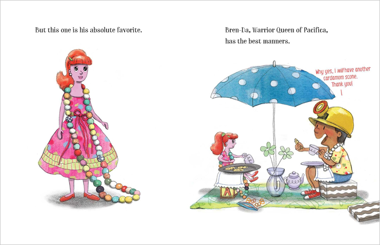 "Teddy¡¯s favorite toy is Bren-Da, Warrior Queen of Pacifica. She¡¯s a pink-skinned Barbie-style doll, and Teddy¡¯s play with her ranges from action-hero combat sequences (¡°She has the sickest fighting skills¡±) to extravagant fashion looks worthy of Project Runway or RuPaul¡¯s Drag Race.... After Bren-Da¡¯s leg falls off, Teddy¡¯s mother mistakenly throws her away.... Teddy¡¯s mother takes his anguish seriously. Valentine¡¯s gouache and pencil drawings blend action and comedy as Teddy¡¯s mother chases the truck with daring moves worthy of Bren-Da herself. ¡°Yas, queen!¡± Teddy shouts in exultation. Trimmer¡¯s smart, closely observed portrait celebrates a boy and a mother whose relationship grows out of mutual respect. Although it¡¯s left unsaid, Teddy¡¯s play resists gender stereotyping in that he¡¯s allowed the freedom to play with whatever toys he likes in whatever way strikes his fancy - and the result is an imaginative free-for-all."
