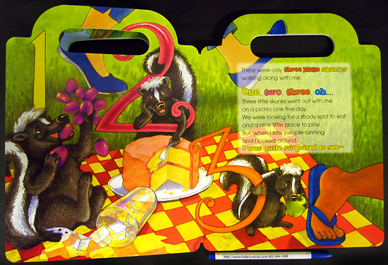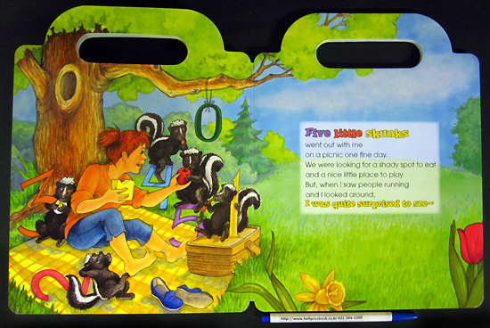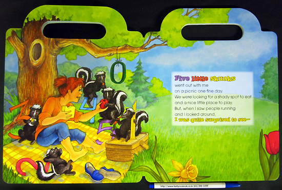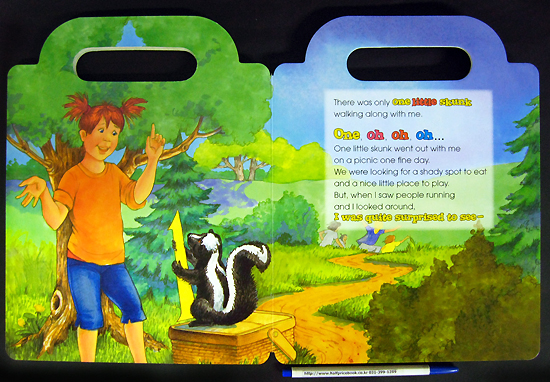 Children will love to learn to sing-along with this original recording of Five Little Skunks. This wonderful book and CD will help children learn numbers 1 to 5 and counting, as well as pre-reading and word recognition skills and features a built-in handle and convenient CD storage compartment. The CD sings the story word-for-word so children can follow along with each page on their own and also includes 13 additional songs to provide more learning opportunities – and more sing-along fun!