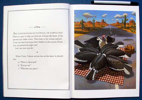 Are your manners monstrous? Or marvelous? Victor Vulture, Crocodila Jones, and their friends demonstrate the right -- and wrong -- things to say and do in this humorous guide to proper manners. The correct answer to each manners question is hidden in the picture. With hilarious artwork and many hidden animals to challenge sharp-eyed readers, this is a fun -- and surprising -- way to learn manners. "Part Emily Post and part I Spy game, this humorous guide to basic etiquette painlessly provides plenty of solid information on societal do's and don'ts." -- Publishers Weekly