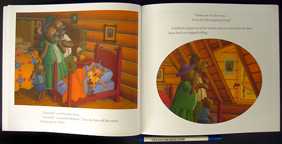 This warm and pleasing retelling of the classic include a rope-jumping Goldilocks in red cowboy boots who bursts with personality. The bears' home is a cozy log cabin set deep in the idyllic woods. The luminous oil-over-acrylic illustrations enhance the story with delightful details. A cylinder of the familiar oat brand sits on the kitchen counter, and a photograph of proud Papa Bear holding a fish and fishing pole hangs in the bedroom. And, characteristic of the Buehners, readers are invited to find a rabbit, cat, and Tyrannosaurus rex hidden in each picture. If your folktale collection could use a freshening up of the Three Bears' story, this is the one to add.