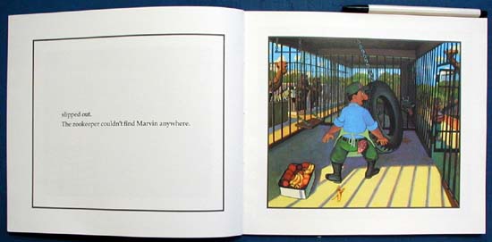 One day `` . . . when the zookeeper wasn't looking, Marvin . . . slipped out.'' The adventuresome ape proceeds to sample the delights of the city, going to the art museum, the movies, and a ball game. In the thickly painted caricatures of New York, Marvin, riding the subway or ordering the jungle fruit platter in a restaurant, is both amusing and surprisingly at home. The humor turns on the fact that big city dwellers rarely look at one another. Children will be in on the joke, which makes them smarter than the police, the zookeeper, and the other people. However, the minimal text does not make the most of the idea. Usually one line placed in the center of a blank page facing the picture, the narrative tends to define the illustration rather than enhance or extend it. These pictures are lively enough to need no definition. In a not unexpected twist to the end, back at the zoo, Helvetica the hippo dashes out when the keeper's head is turned. While Marvin is a sly blend of ape and human, the purple hippo is not as immediately believable, but who knows . . . if she buys a nice flowered dress, she will probably fit right in with the other ladies out for an afternoon of shopping. While not a necessary purchase, this will nevertheless produce a few chuckles. |