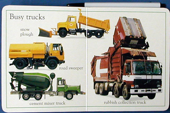 The original board book in DK Publishing's My First Word series was My First Word Board Book. My First Truck Board Book was designed with the same principles in mind... displaying crisp, colorful photographs of objects that kids respond to, with the name of each object clearly identified. First you'll find "Busy trucks," including a snowplow, street sweeper, cement mixer, and garbage truck. Other spreads are "Road builders," "Loaders and lifters," and "Diggers." The book closes with a few simple games--matching close-ups of tires to the machine they go with, and matching the vehicle with the right "young professional," for example. Kids obsessed with trucks won't even know they're on the road to reading! (Baby to preschool)