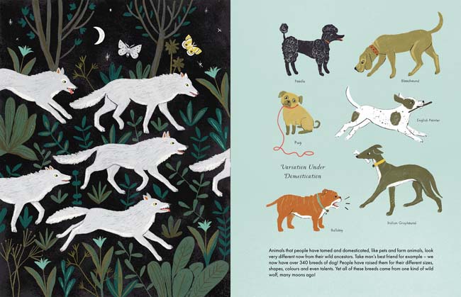 Radeva introduces the story of evolution through accessible, picture-filled spreads. ¡°Since life on Earth began, tiny organisms, plants and animals have been changing slowly, over millions of years.¡± The text briefly presents a smartly suited Charles Darwin, his journeys aboard the HMS Beagle, and the observations that resulted in the publication of his magnum opus. Animals shown in chalky, stylized art (Radeva takes a primarily nonnaturalistic approach) are used to illustrate complex concepts such as species, variations, competition, and natural selection. One spread depicts gray wolves in an ornately rendered nighttime forest opposite several domesticated dog breeds. Quotes from Darwin are also integrated throughout. While the book may not help readers fully grasp the incremental nature of evolutionary change, it is a welcome primer on the topic.
