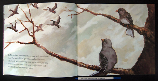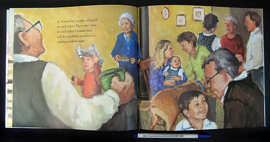 November is an in-between time, a time when the air grows colder and nights grow longer. It's a time when the earth and all of its creatures prepare for the oncoming winter. It's a time of harvest and thanksgiving, when people gather together to celebrate their blessings with family and friends. All of this, and more, are captured within the pages of this captivating hardcover picture book. Rylant's words are plainspoken and poetic, crisp as an autumn apple. Kastner's luscious oil paintings are rendered with bold, loose strokes in a traditional fall palette—rich reds, warm browns, soft yellows, bright oranges and frosty whites. Words and pictures work well together, and the overall effect is one of calm, peaceful transition from one season to the next. A great read-aloud for classroom or home.