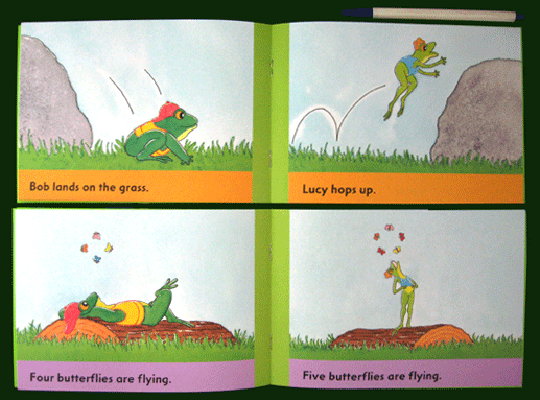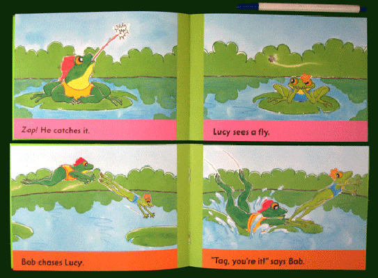 This book in the series "Brand New Readers" is designed to help children learn to read. An introductory page gives instructions on how to help a child read this book. There are four chapters of stories about two frogs, Lucy and Bob. The first page of each chapter is to be read by the adult. It summarizes the story but does not tell all. The child reads the story that is written in simple sentences, one on each page, with an illustration to help provide clues and aid in comprehension. The introduction gives suggestions of methods to help the child read, such as looking at the pictures together before reading it aloud, and reading one or two pages to the child while the adult places his finger under each word. The stories, each consisting of only eight sentences, are fun, and all have a cute ending. Children will enjoy the little adventures of the two frogs and can develop a sense of achievement when they are able to read complete stories. This book is a valuable tool in helping a child learn to read. The small size of the book is just right for little hands to hold. |
