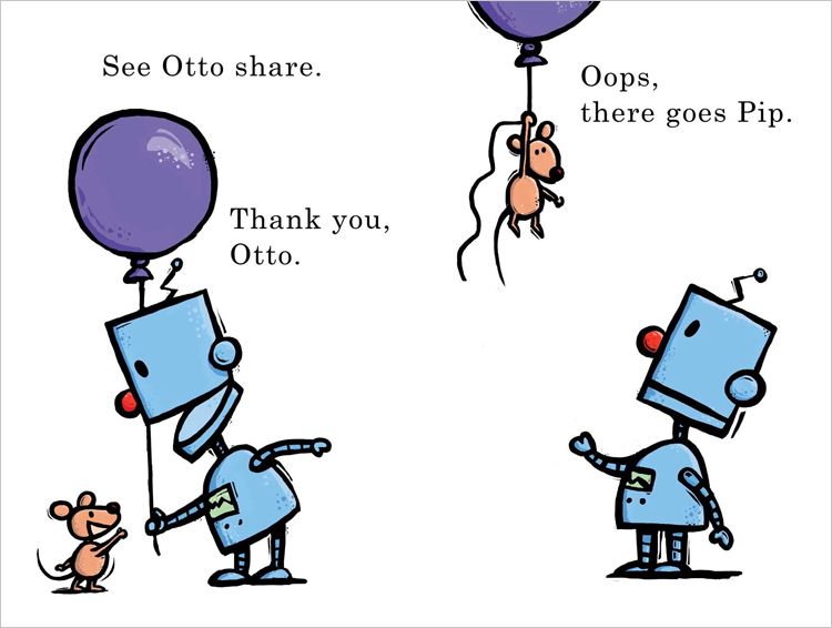 "In his third beginning reader about Otto the robot, Milgrim (See Otto, 2002, etc.) introduces another new friend for Otto, a little mouse named Pip. The simple plot involves a large balloon that Otto kindly shares with Pip after the mouse has a rather funny pointing attack. (Pip seems to be in that I-point-and-I-want-it phase common with one-year-olds.) The big purple balloon is large enough to carry Pip up and away over the clouds, until Pip runs into Zee the bee. (¡°Oops, there goes Pip.¡±) Otto flies a plane up to rescue Pip (¡°Hurry, Otto, Hurry¡±), but they crash (and splash) in front of some hippos with another big balloon, and the story ends as it begins, with a droll ¡°See Pip point.¡± Milgrim again succeeds in the difficult challenge of creating a real, funny story with just a few simple words. His illustrations utilize lots of motion and basic geometric shapes with heavy black outlines, all against pastel backgrounds with text set in an extra-large typeface. Emergent readers will like the humor in little Pip¡¯s pointed requests, and more engaging adventures for Otto and Pip will be welcome additions to the limited selection of funny stories for children just beginning to read. |