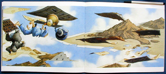 In an odd wordless picture book about a dream, a fair-haired boy falls asleep while reading an ominous looking atlas. As he floats through sky and slumber, the boy's green checked bedspread is transformed into an aerial view of the earth. He then descends upon an enormous chess board complete with mortal playing pieces. This medieval welcoming party leads the youngster to their mazed castle where he continues his search (although this is not always clear) for an elusive map. The nameless protagonist's ensuing adventures are confusing, complicated, and illogical. Transformations abound in this surrealistic universe. Floating leaves change into swans, fortress walls become dragons, building fronts turn into mountains. The influence of such literary classics as Gulliver's Travels, The Wizard of Oz, and The Water-Babies, along with the artistry of Raphael, Escher, and Sendak, is apparent. Soft shades of green, blue, and yellow dominate the action. Technical virtuosity is the trademark of the double-page watercolor spreads. Especially notable is the solidity of forms and architectural details. While many of the illustrations are stunning, if somewhat slick, they work better as individual pieces than as a whole. This book lacks the sequence and logic required by young children, and it will have limited appeal among older children.