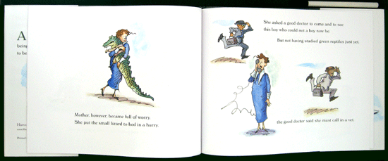 In terse, bouncy verse, Rylant tells a story that may be tongue-in-cheek, and so must be taken with at least a grain of salt. A boy who is "tired of being a boy" and "hoped to be somebody new" is happy to receive, as a gift from his aunt, a head and tail which, when put on, help him become "quite a fine alligator." His father seems to accept this transformation, perhaps because the illustrations portray the boy inside. But his upset mother must be reassured by a veterinarian before she sends him off to school. There he cheerfully engages in all the usual activities while enjoying the chance to frighten the bullies. At home, he is still happy to sit in his mother's lap. Goode requires only the minimum of props to produce a delightfully imaginative sequence of drawings "in line" with watercolors and gouache providing the particulars that the very succinct rhymes ignore. Somehow, she manages to make us believe in this boy/reptile as he goes about playing the piano or singing. In the final scene of togetherness, we are convinced of the satisfying appropriateness of the supposed transformation. Lift the jacket to enjoy the contrasting cover.