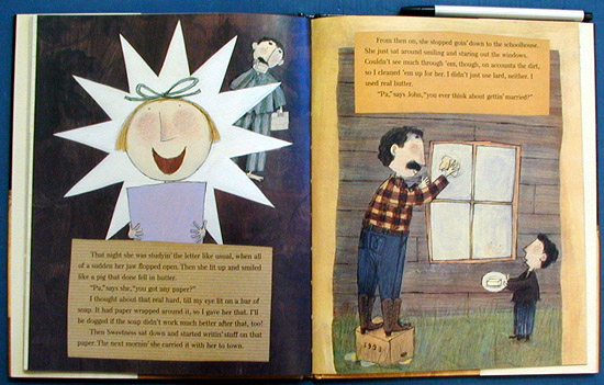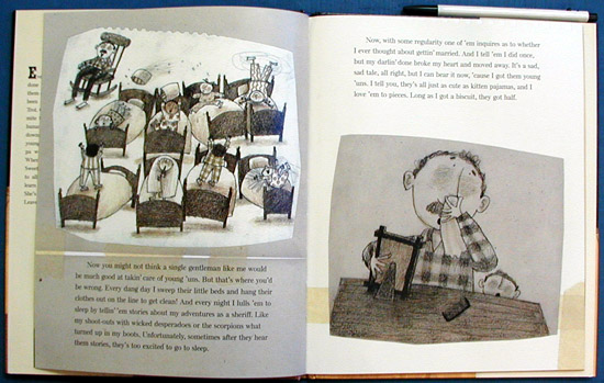 "Long as I got a biscuit, they got half." When it comes to raising the eight orphans he rescued (with more than a li'l help from Sweetness) from the evil Mrs. Sump, the sheriff clearly has his heart in the right place. Even if his homemaking skills are a little shaky: "Timmy's pants had a great big tear in 'em and I forgot to buy tape three days runnin'." He's also liable to rustle up tuna fish soup or spaghetti with peanut butter for dinner. And he can't read, neither, which poses a particular problem when a letter arrives for him. But a covert raid on literacy skills by Sweetness brings home contentment-not to mention an improvement on the sheriff's cooking. This sequel to Saving Sweetness (rev. 9/96) answers Diane Stanley's pitch-perfect narrative drawl with G. Brian Karas's homespun-on-the-range pictures, a cozy m,lange of media that warms the comedy with affection. The round-headed, dot-eyed characters have the aplomb of children's drawing, but there's plenty of sophistication in the dramatic placement of the figures and the effective page-turns; funny details, such as the tied-back trousers that serve as window treatments, reward close attention.