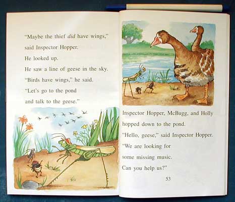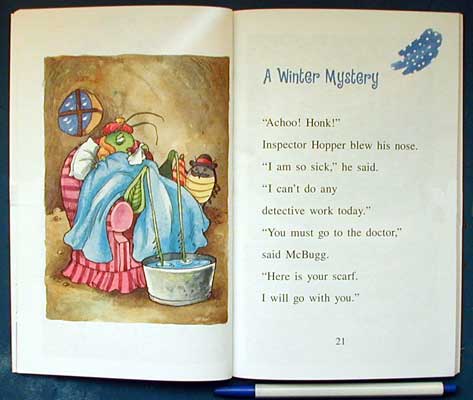The four cases follow the seasons, beginning with fall. Emma Worm believes she is hearing a ghost in the pumpkin next door. Inspector Hopper and McBugg solve this mystery without much trouble, but McBugg, insatiable as always, wonders what a house (pumpkin) tastes like. During the winter both Inspector Hopper and the doctor suffer from severe colds. The ending notes that misery loves company. In the third case, deductive skills are put to the task as a string, paper and strong wind on a March day help the detectives find the answers to the disappearance of Miko, Mrs. Bettle's little daughter. The concluding story involves the cricket and the missing music sheets. The creative solution may bring a smile. Also parents will get the play on words "I present you to my buddy, Holly, and the Crickets!" but young readers will take it at face value since they will probably not know of Buddy Holly and the Crickets. "An I Can Read Book" 2003, HarperCollins, - Marilyn Courtot 0060089628