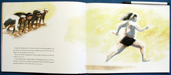 An abridgement of the novel Sadako and the Thousand Paper Cranes combined with images from a film adaptation of the work yields a complex and somewhat abstract picture book. Using a sampling of the illustrations he created for the movie version, Young ( Seven Blind Mice ) subtly accentuates the poignancy of the story without rendering it sentimental. His ethereal pastels (reminiscent of his art in The Red Thread ) seem to convey the mood, rather than the actual activity, of the text. Sweeping panoramas alternate with wispy image fragments against ample white space: a face half-concealed, a shadow darting past. Coerr's condensed text succeeds in retaining the simple lyricism of the original, allowing the leukemia-stricken Sadako to emerge as a quietly courageous girl. Given the necessary length of the text, the mature subject matter and the sophisticated artwork, this book may find its most welcoming audience among older readers, especially those who enjoyed its original version as a novel.