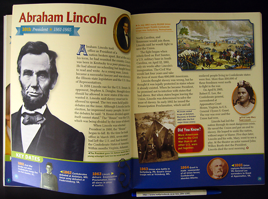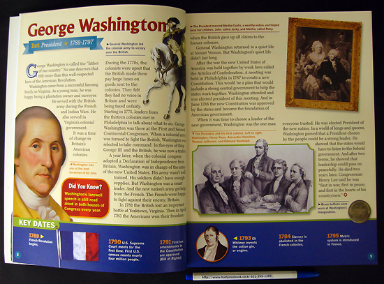 Following a brief history of the presidency and a description of the three branches of government, the presidents are profiled in chronological order. Attention is paid to the subject's early life, tenure in office, and life thereafter. Part three consists of a thumbnail look at each leader: birth, death, home, political party, vice president, and wife and children. The somewhat breezy text, with few details, is printed on a buff-colored background. Each article is accompanied by a portrait, photo, or reproduction of something related to that presidency and a Did You Know? box. A campaign button, banner, or similar realia are often included. Photos, where possible, are in color. A time line in dark blue at the bottom of the page lists three dates of significance during each administration. Two pages are devoted to Washington, Lincoln, FDR, Truman, and Clinton. Everyone else gets a page. An article about the First Ladies, only 12 of whom are mentioned; a short article about and a cutaway diagram of the White House; postcard images of six other Washington, DC, landmarks; and a page of trivia are also included. Better suited to pleasure reading than for reports, this up-to-date volume is a solid addition to most collections |