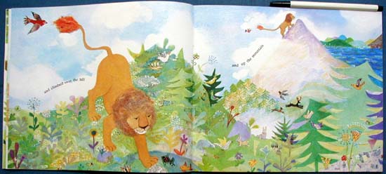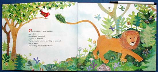 "A little bird and a lion, friends although they don't understand one another's language, are inexplicably happy when they're together. The bird loves the sight of the lion's tail, which changes color daily. When the lion brings the bird into his cave, she understands the changes; the lion uses his tail as a paint brush for creating beautiful murals. . . . Kindergarten to gradetwo." (SLJ)