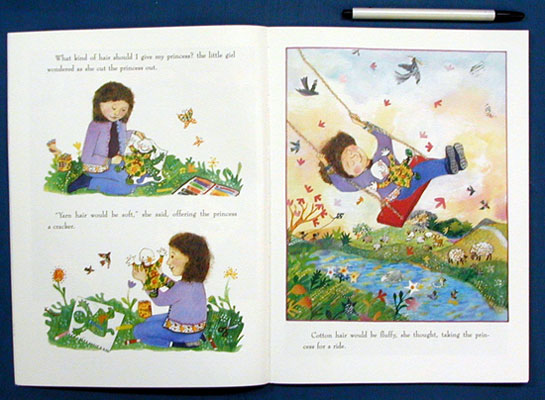 This charming tale begins when the wind carries a freshly cut, unfinished paper doll princess up in the air. She still needs hair. Her creator cries out "Wait! I didn't finish you!" "I'll finish myself," the princess calls back. "But I want to play with you!" pleads the little girl. "You're the best thing I ever made. Don't blow away!" Though the paper princess tries to drift back down to the little girl, the wind has other ideas and carries the princess in a different direction. She's thrust into many kinds of adventures... in the hands of a boy on a Ferris wheel, at the mercy of another girl's attempt to give her hair, and in the beak of a bird that rescues the paper doll from ending up as a discarded crumpled lump in a trash can. But with her friendly, strong-willed nature, the princess holds fast to her dream to return eventually to her little girl who made her. And that's just what happens. Vividly illustrated in collage art that has a magical quality all its own. - Marilyn Bagel