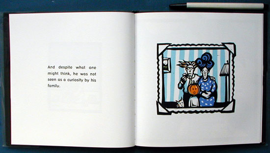 Otho is a boy born with a pumpkin for a head. His family accepts this and Otho goes on his way much like a normal boy. That is, until a bat decides his pumpkin head would make an excellent nest and plucks it off Otho's body. However, pumpkin heads are apparently heavier than they look and he is unceremoniously dropped into the sea, where he is eaten by a great fish, squeezed out of the fish by a great squid, caught by a fisherman and returned to his family through the great luck of his mother finding him at the fish market. A strange tale that's strangely unappealing, some small children may be distressed by the bat's easy removal of Otho's head from his body. Rohmann's unusual artwork lends some appeal to the story, easily capturing a small boy's expressions on a pumpkin face. Primarily colored in black, white and blue with splashes of orange on Otho's head, the pictures are easily more entertaining than the story. 2003, Alfred A Knopf, Ages 5 to 8. - Sharon Oliver