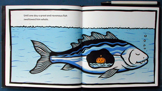 A perfect blend of art and text works together to convey the adventures of a boy born "with a pumpkin for a head." A crafty flying bat plucks up Otho's head and explains in rhyme why he drops it into the sea. After a large fish swallows it, an even larger squid squeezes the fish, with Otho shooting out, "like a cork from a popgun." In excellent pacing, the next page shows the pumpkin-head hero drifting at sea, then scooped up by a fisherman. Young children are sure to enjoy the bouncing rhythm of the fisherman's words as he compares Otho to all the other types of fish he has netted. Besides black and white, Rohmann consistently uses shades of blue and patches of orange throughout. In this artwork, less is truly more. The multiple-color relief prints done on an etching press, with large white space surrounding smaller, movie-still-like pictures, enhance the visual appeal. In Otho's face, Rohmann captures the vulnerable emotions of a lost child, and the wide smiles when returning to a mother's embrace. Gather your little pumpkin heads close to you in the fall as you read them this tale and watch their faces light up with a glowing grin.