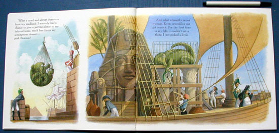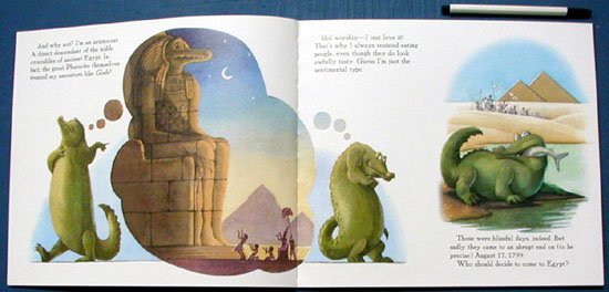 e-book artists as gifted or versatile as Fred Marcellino. And so, this first book both written and illustrated by him is of far more than routine interest. "A direct descendant of the noble crocodiles of ancient Egypt", this reptilian hero is a shameless scene stealer whose greatest joy is eating. "(Actually, overeating.)" When he is captured and shipped to France by no less a personage than Napoleon, he is "an overnight sensation!....The Toast of the Tuileries!" But alas, his ego is better fed than his voracious appetite. Children will be enchanted by the crocodile's ridiculous shenanigans and possibly just a bit shocked by his unexpected solution to the problem of finding a satisfactory meal. The story is weak, however, and far less compelling than Marcellino's inspired pictures. (Selma G. Lanes, Parents' Choice?, 2000)