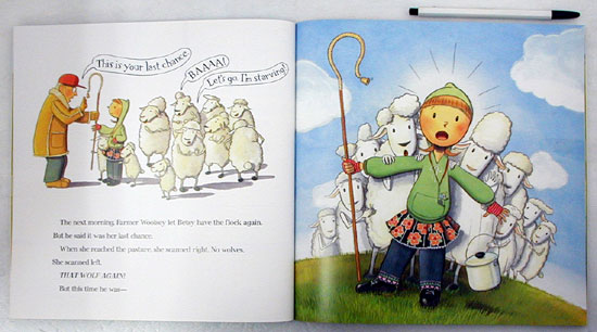 After completing a course in becoming a shepherd, Betsy leads her sheep up the hill. Unknown to her a wily and hungry wolf named Zimmo has a plan to eat some sheep by tricking the villagers into not believing Betsy's cries of wolf. Zimmo is successful in having the villagers believe that Betsy is just playing a joke on them, but also begins to feel sorry for tricking her, as he can tell that she is trying her best. When the time comes to actually eat the sheep Betsy instead shares her lunch with the hungry wolf and he helps her herd the sheep. The villagers realize their mistake and apologize to Betsy. This story takes a lighthearted approach to the traditional fable and teaches that sometimes people should be believed even when the evidence indicates otherwise. The illustrations add to the lightheartedness with an almost comic appeal.