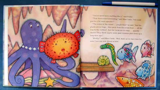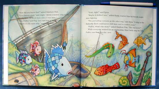 Rainbow Fish and his friends welcome a new friend to their school. Puffer allows as how he has been all over the world and knows the area that Angel comes from. He makes up a tale and Miss Cuttle remarks that she loves a good tall tale. It turns out that Puffer has told several tall tales, including one about how the sunken ship has come to rest on the reef. When he tells a story that has some truth to it, of course his classmates don't believe him. Eventually at show-and-tell, he is slightly vindicated, and Angel becomes a new friend. The story about exaggerating and not telling the truth comes through loud and clear. Part of the series "Rainbow Fish & Friends." 2001, Night Sky Books/North-South, - Marilyn Courtot