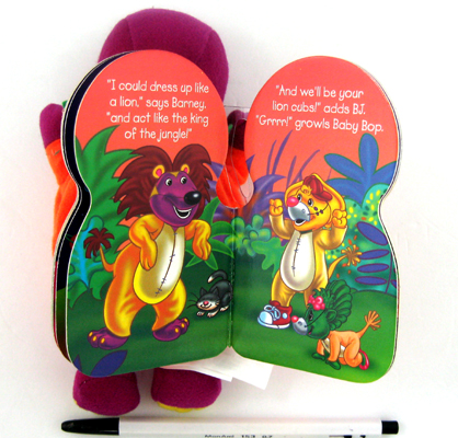 Barney the purple dinosaur and his friends decide what they will be for Halloween.