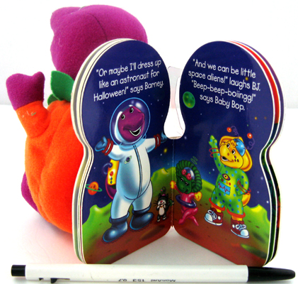 Barney the purple dinosaur and his friends decide what they will be for Halloween. |
