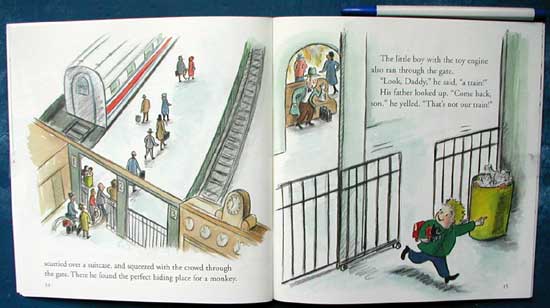 Down at the train station everyone is busy. No one notices a little monkey until he tries to help with the schedule board. Soon George is hiding from an angry train master and notices something himself, a boy in trouble. Then it's George to the rescue. By lending a helping hand (or two) Curious George gets a new friend, a big thank you, and a very special seat on the train.