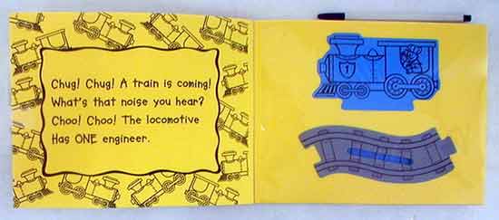 Pop out the train cars and the curvy, interlocking tracks to build a long locomotive. Count from 1 to 4 as one engineer calls out hello, two cats meow from the boxcar, three new automobiles beep from the flatbad, and four children wave goodbye from the caboose! |