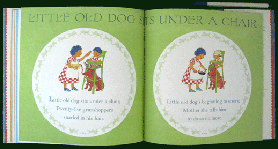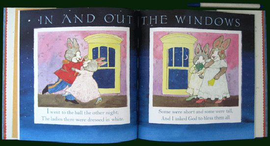 This third collection by Opie and Wells includes 22 less-familiar rhymes. According to Opie's introduction, " . . . the little treasures in this book . . . are the most mysterious fragments of our shared memory." Some rhymes are silly ("Little old dog sits under a chair,/Twenty-five grasshoppers/snarled in his hair . . . .") Others are surreal. For example, "Mother, May I?" poses the question, "Mother, may I go out swimming?," which is answered, "Yes, my darling daughter;/Hang your clothes on a hickory limb,/But don't go near the water." Meanwhile, the picture shows a little girl, waist-deep in a pool, pulling a little boat and holding a doll that looks just like the little girl, which does transform this playful verse into something, yes, mysterious. Many of the characters make multiple appearances, and many are Wells's characteristic rabbits and cats. The very nature of this book makes it a less-essential purchase than this team's My Very First Mother Goose (1996) or Here Comes Mother Goose (1999, both Candlewick), so possibly only larger collections or libraries with lots of Rosemary Wells fans will want it.