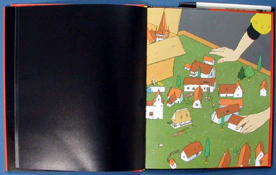 Beginning with a close-up of a rooster's comb, each picture zooms out to give a more distant perspective; for example, the "camera" zooms out to show increasingly distant figures of children watching the rooster. Then, a large hand appears, showing that the scene was not depicting a real farm, but a toy farm set. But zoom out a few more times, and the scene reveals that the picture of the girl playing with the farm set is really on the magazine held by a boy, who's sleeping in a chair, which is by a pool, which is on an ocean liner, which is out at sea--no, wait--that picture is on a cruise-line poster on the side of a city bus, but that picture is on a television screen in the Arizona desert . . . and so on until the earth is shown from above, growing smaller with each turn of the page. The final scene is one white dot on a black page. Clear-cut paintings outlined in ink appear on each right-hand page; the left-hand pages are black. Not a story, but an "idea" book, it makes the viewer ask, "What am I really seeing here?" This clever picture book could be intriguing or irritating, depending on the viewer's frame of mind, but children will find it worth a look.