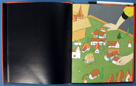 This provocative wordless volume can be "read" either from front to back or even from back to front. Either way, it's a startling experience. Its illustrations "zoom" out, as though a viewer has rapidly backed away from each. For example, the first painting, of a jagged-edged red shape, turns out to be a detail of a rooster's comb; as the pages turn, the bird diminishes in importance, until the barn where he stands is shown to be a toy on a magazine's cover. That magazine dangles from the hand of a dozing boy, who himself becomes but a smudge on an advertising billboard. These shifts in perspective repeat until the book abandons earth altogether. The last image is a tiny white sphere-our planet-against a night sky. The bold color and level of detail in Banyai's cartoons recall "Prince Valiant" or another of the "realistic" Sunday comics. If the concept is not wholly new, the execution is superior. Readers are in for a perpetually surprising-and even philosophical-adventure. All ages.