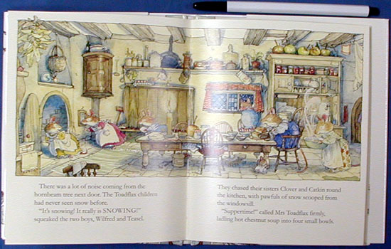 Designed with an appropriately small trim size, the four books relate the adventures of the anthropomorphic mice of Brambly Hedge. The diminutive illustrations of their elaborate tree-trunk homes and the surrounding hedgerow are filled with details that encourage the reader to peer closely at the pages. The cozy stories all take place in fall or winter. |