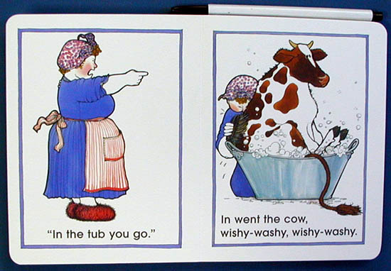 Cow, Pig, and Duck are playing in the mud, when along comes Mrs. Wishy-Washy. "Oh lovely mud," think the three friends. But Mrs. Wishy-Washy says, "Just LOOK at you!" and washes them clean: wishy-washy, wishy-washy.