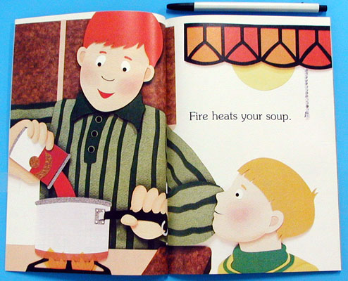 This book is a boldly illustrated fire safety book and part of the "Hello Science Reader" series. The beneficial applications of fire are presented; cooking, warming, birthday candles-but then the warnings. Fire can be harmful. Matches, fireworks, and grills are depicted as potential hazards. Stop, drop and roll and family fire escape routes are emphasized, as is the importance of telling adults about a fire. |