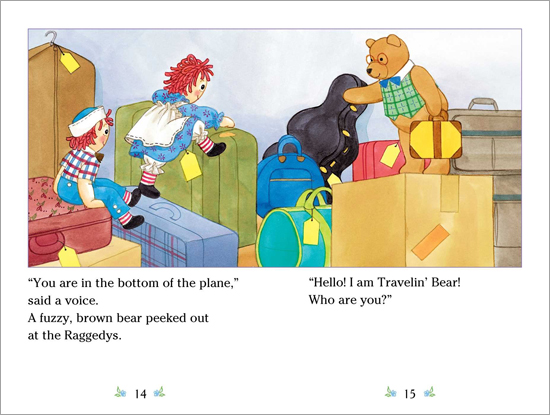 Billed as a 'Ready-to-Read Book', it is one in a series of "Raggedy Ann and Andy" level books designed for beginning readers. This one is Level 1, Starting to Read, featuring "simple stories, increased vocabulary and longer sentences," as compared to Prelevel 1. Raggedy Ann and Andy belong to Marcella, a young girl on her way to visit her Grandmother. This is Raggedy Ann and Andy's first plane trip and although stored in the baggage compartment, they succeed in having an adventure of their own. They meet a friend called Travelin' Bear who urges them to stay on with him for some great adventures. They both agree they would miss Marcella too much. They finally arrive at their destination and wave goodbye to their new friend. This is a very simple story, with the motivator being Raggedy Ann and Andy. Level books are the "new" strategy for assisting readers that may be having difficulty decoding words. The spacing of words and sentences in this book is a bit strange, but maybe that is part of the strategy. Usually, level readers include a list of new vocabulary to alert parents and teachers of possible difficulties or words that may need some introduction. It would have been helpful if new vocabulary and some tips for assisting beginning readers were included. Otherwise, the illustrations are fetching and take up enough space so that new readers do not become overwhelmed with text. It is nice to see Raggedy Ann and Andy on the scene again after a long absence. |