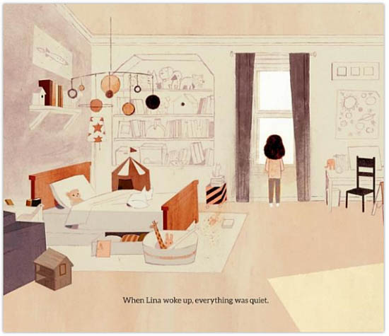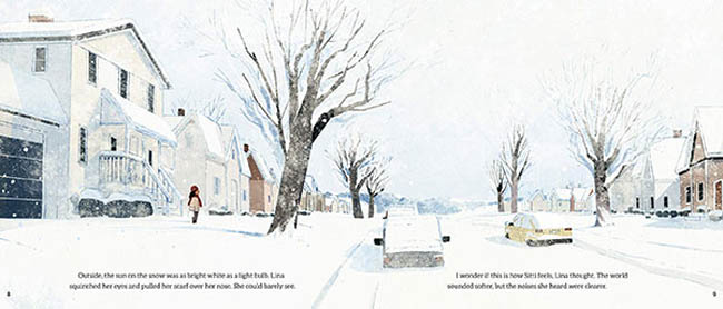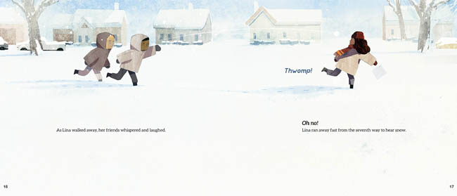 One winter morning, Lina wakes up to silence. It's the sound of snow -- the kind that looks soft and glows bright in the winter sun. But as she walks to her grandmother's house to help make the family recipe for warak enab, she continues to listen.