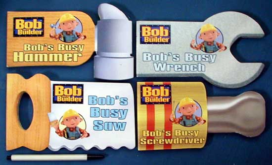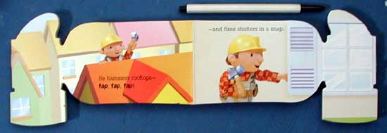 The red cardboard box is shaped like Bob the Builder's tool kit. When the two snaps are opened kids will find four tool shaped board books inside.Bob's Busy Wrench demonstrates how this tool is used for gripping and tightening things. He uses the wrench to fix a radiator knob and to tighten the lugs on a tire. In Bob's Busy Hammer, he uses the hammer to nail floor boards, build a door frame, and fix a roof. The hammer can also be used to remove nails. His last task is to drive a nail into the wall to hang a picture. Bob's Busy Saw shows him trimming a tree branch, cutting lumber to specific lengths to build a fence and picnic bench. Bob's Busy Screwdriver depicts all the things that Bob fixes with his trusty tool. He screws door hinges and a desk. When it is all done, Bob sits down with his mug to watch some TV. "Nice job, Bob!" Plenty of fun for all those kids who want to pretend they too are builders. 2003, Simon Spotlight/Simon & Schuster, Ages 2 to 4. - Marilyn Courtot |