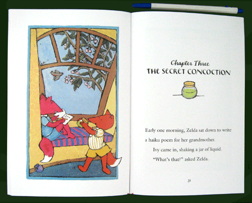 Another appealing offering featuring the spirited fox sisters. In the first chapter, Zelda and Ivy run away from home when cucumber sandwiches appear on the lunch menu. They take a blanket and their favorite toys to their backyard, where they can keep an eye on their parents, who don't seem to miss them at all. When they finally go back inside, they discover that their father has saved them the very sandwiches that they were trying to avoid. In the second episode, the siblings are making a time capsule to be opened in one hundred years. Zelda drops in her lucky jewel, while Ivy adds her cherished doll. It doesn't take long, however, for the sisters to realize that they can't part with their favorite possessions. The third chapter finds Ivy making a secret potion and Zelda struggling to write a haiku. Then their friend Eugene comes up with a clever way to use Ivy's concoction to ease Zelda's writing pains. Bright, expressive cartoon illustrations complement the fine writing in this beginning reader.