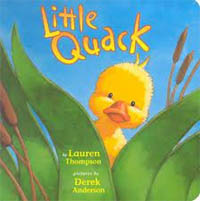 Debut artist Anderson's portrait of a quintet of plucky ducklings and their enticing pond habitat make this familiar tale memorable. Widdle, Waddle, Piddle, Puddle and Little Quack are perfectly content to remain in the nest and view the pond from afar. But Mama Duck will not give up until they take their first swim. "Come little ducklings," she says. "Paddle on the water with me." Anderson paints the pond surface as a velvety quiltwork of violets and shimmery sky blues. A clunky "Quack-U-Lator"-a purple box that runs along the bottom of every spread-keeps track of the ducks entering the water (e.g., when Widdle and Waddle are swimming, the Quack-U-Lator shows two duck icons on the left, joined by the plus sign, and the numeral 2 follows an equals sign; opposite, in capital letters, reads, "Two ducklings in the pond"). With a judicious use of repetition and an ear for both Mama's mellifluous pleadings and the squawkings of her recalcitrant crew, Thompson's (Mouse's First Christmas) text trips off the tongue. But it's Anderson's depiction of the adorable ducklings, working up their courage to join their fuzzy siblings ("You can do it,... I know you can," cheers Mama) that will keep toddlers coming back. The cocky look of the ducklings already floating, and the expression of lone Little Quack as he tentatively dips a tip of his webbed foot in the water, will make this a nursery favorite.