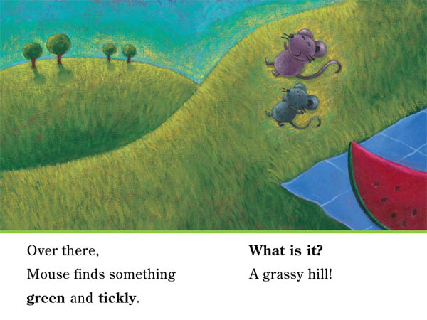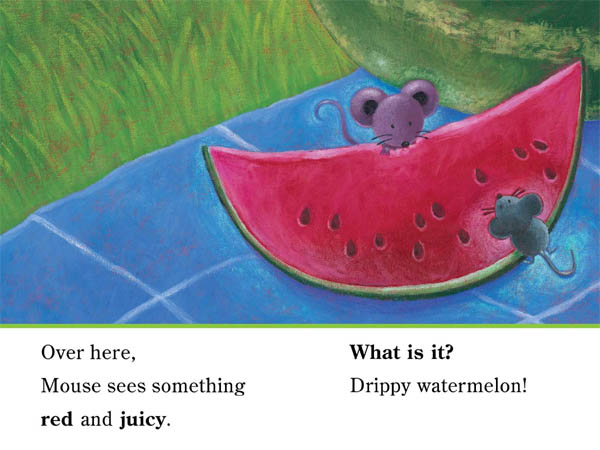 One sunny summer day, Mouse and Minka head outside to play! They decide to go on a picnic in the park where they discover: drippy, sweet, wet watermelon; tickly-tumbly green grass; and wink, blink fireflies glowing.