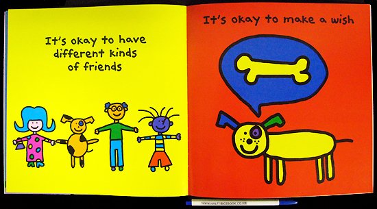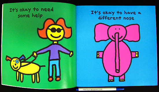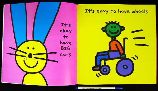 A very colorful and fun book about appreciating diversity. The characters in the stories are amusing, yet respectful. I especially loved, "It's okay to be adopted with a puppy in a kangaroo's pouch." Some other examples are: "It's okay to have wheels," "It's okay to have big ears," "It's okay to be a different color," and "It's okay to do something nice for your friends." Young children will love the illustrations, and all readers will enjoy the message and humor.